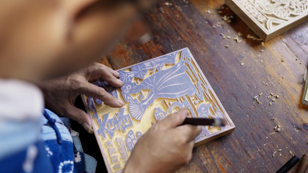7月5日,喜洲匠志集民藝中心甲馬版畫藝術館內(nèi),工匠正在雕刻甲馬。新華社發(fā)(羅曉川攝)
