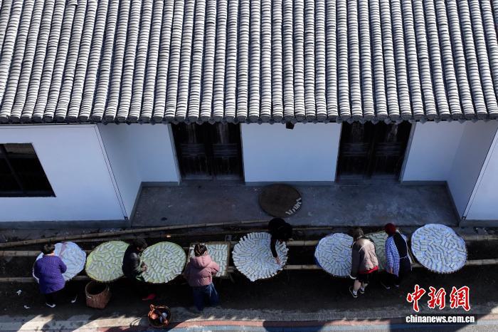 1月8日,在蔡家橋鎮(zhèn)朱旺村,村民晾曬加工好的年糕。(無(wú)人機(jī)照片)中新社記者 儲(chǔ)瑋瑋 攝