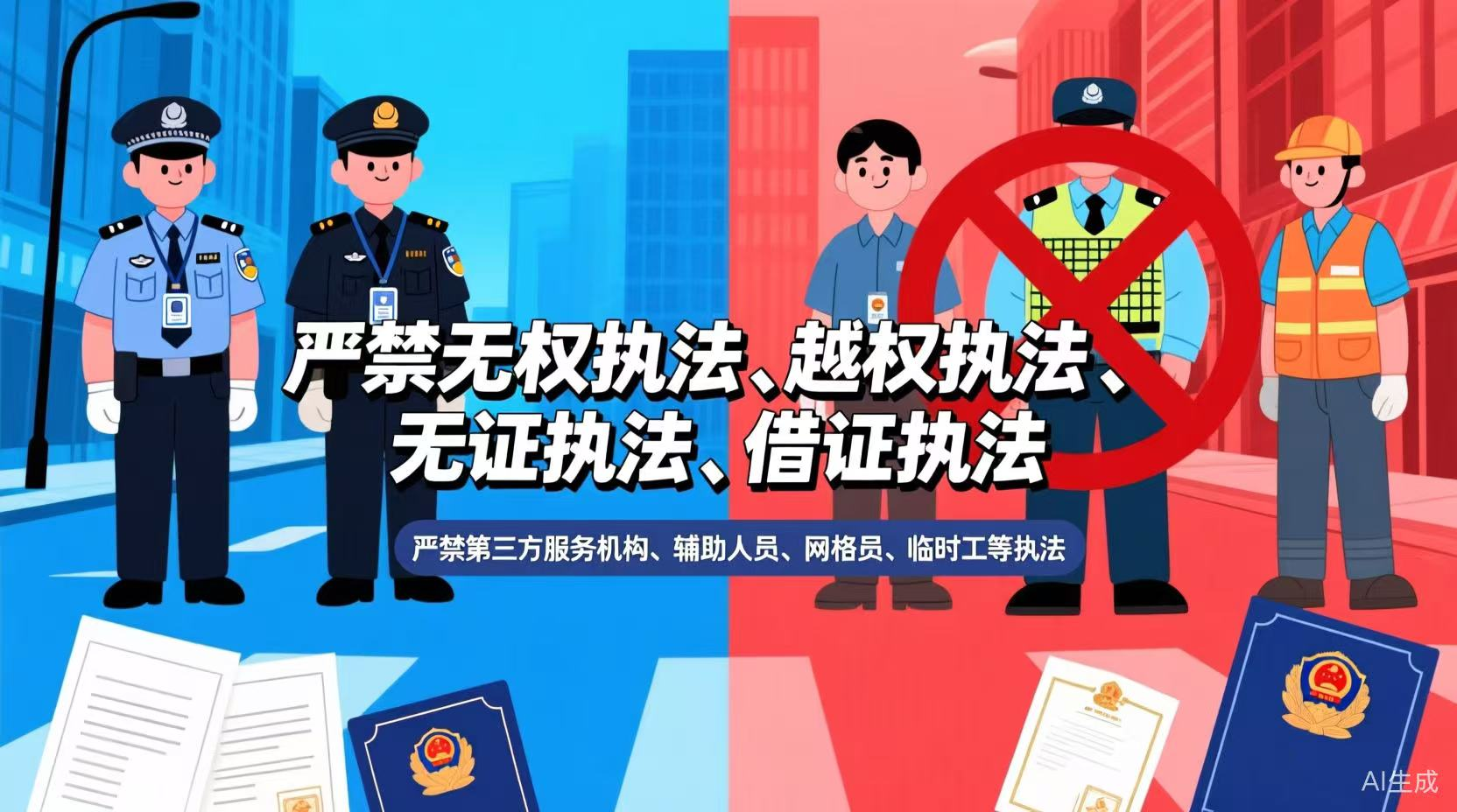 嚴(yán)禁無權(quán)執(zhí)法、越權(quán)執(zhí)法、無證執(zhí)法、借證執(zhí)法。嚴(yán)禁第三方服務(wù)機構(gòu)、輔助人員、網(wǎng)格員、臨時工等執(zhí)法。