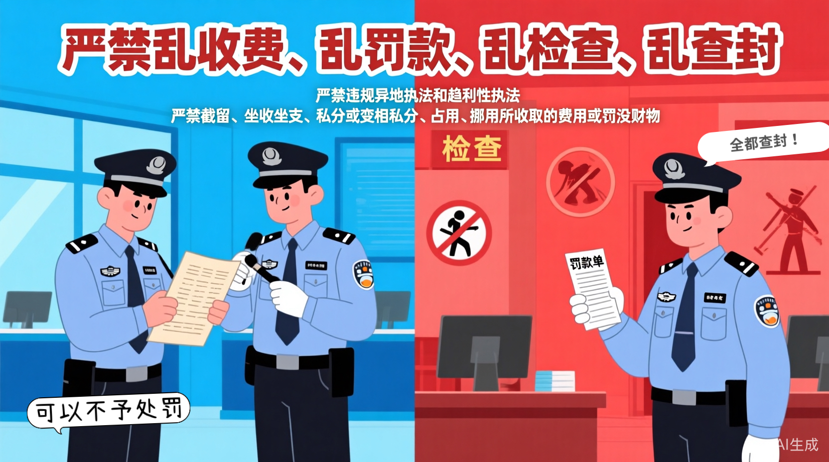 嚴(yán)禁亂收費、亂罰款、亂檢查、亂查封。嚴(yán)禁違規(guī)異地執(zhí)法和趨利性執(zhí)法。嚴(yán)禁下達(dá)或變相下達(dá)罰沒指標(biāo)。嚴(yán)禁截留、坐收坐支、私分或變相私分、占用、挪用所收取的費用或罰沒財物。