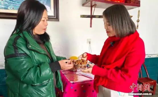 “鄉(xiāng)村CEO”廖紅(右)來到村民家收購?fù)撂禺a(chǎn)。中新社記者 唐小晴 攝