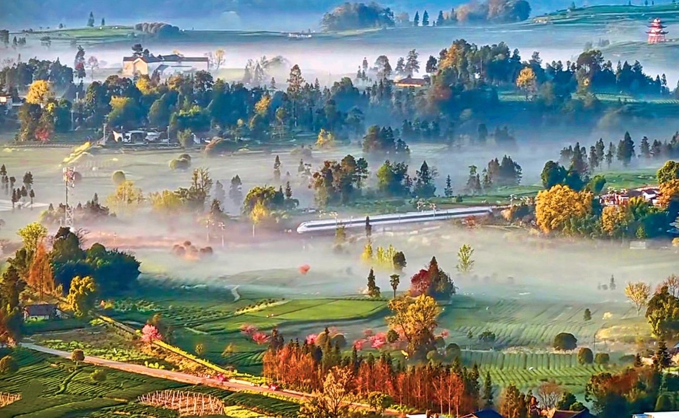 近日,一段拍攝于四川省雅安市名山區(qū)的茶園航拍視頻火爆全網,更登上央視新聞、人民日報等多家中央級媒體平臺,讓名山的春日茶景驚艷全國。畫面里,朝霞映照茶山,晨霧繚繞在層層疊疊的茶壟間,一列動車如銀龍穿梭其間,車影與薄霧相融,金黃晨光與翠綠茶田相映,遠處村落若隱若現,宛若現實版《千里江山圖》,被網友盛贊“每一幀都是壁紙”。