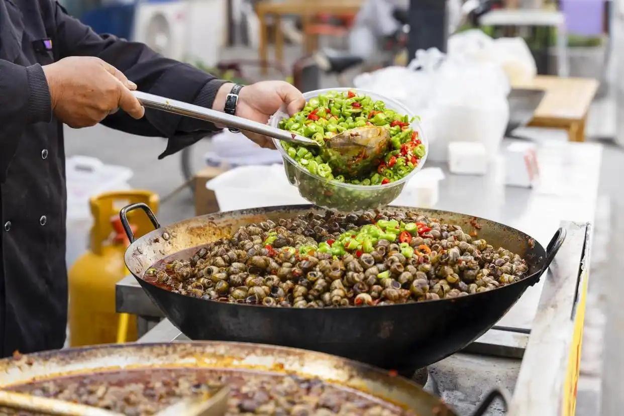 攤主正在現(xiàn)場烹飪螺螄(央廣網(wǎng)發(fā) 淮安市洪澤區(qū)委宣傳部供圖)