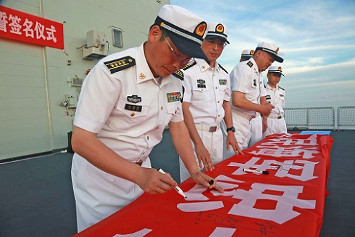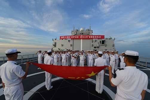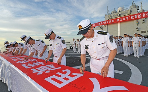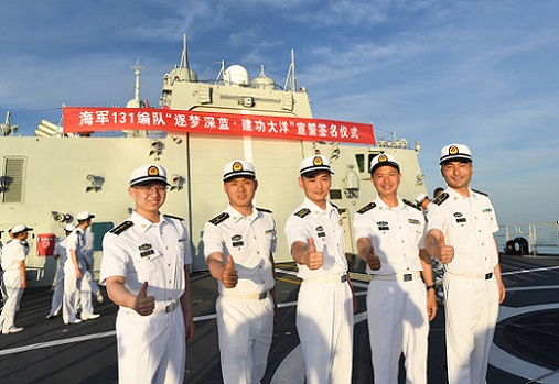 萬里航程剛剛起步,履行使命任重道遠(yuǎn)。編隊(duì)指揮員紀(jì)樂江在宣誓儀式上號(hào)召大家,要以通過赤道這一特殊地理原點(diǎn)為新的起點(diǎn),把逐夢(mèng)強(qiáng)國(guó)強(qiáng)軍、闊步世界一流的雄心壯志,化作鐵心向黨、絕對(duì)忠誠(chéng)的堅(jiān)定信念,化作直面強(qiáng)敵、敢于亮劍的無畏勇氣,化作嚴(yán)謹(jǐn)求實(shí)、追求卓越的過硬作風(fēng),化作攻堅(jiān)克難、連續(xù)作戰(zhàn)的頑強(qiáng)斗志,以一流的標(biāo)準(zhǔn)、一流的成績(jī)、一流的風(fēng)采,切實(shí)做到不負(fù)時(shí)代重托、不辱光榮使命。