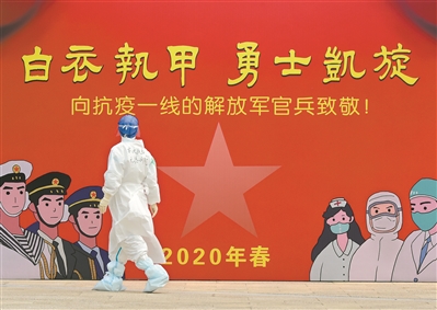 上圖:4月5日,在武漢泰康同濟(jì)醫(yī)院,護(hù)送一名新冠肺炎治愈患者出院后,軍隊(duì)支援湖北醫(yī)療隊(duì)隊(duì)員葉洪江從院區(qū)內(nèi)的展板前走過返回病房。