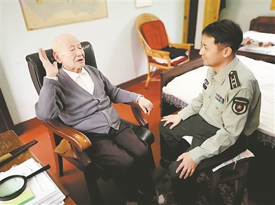 上圖為紀曉飛(右)傾聽老干部講述戰(zhàn)斗故事。徐文靜 攝