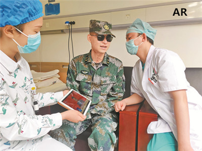 上圖:陸軍軍醫(yī)大學(xué)第一附屬醫(yī)院醫(yī)護人員與杜富國一起收聽兩會新聞。馬璽君 攝