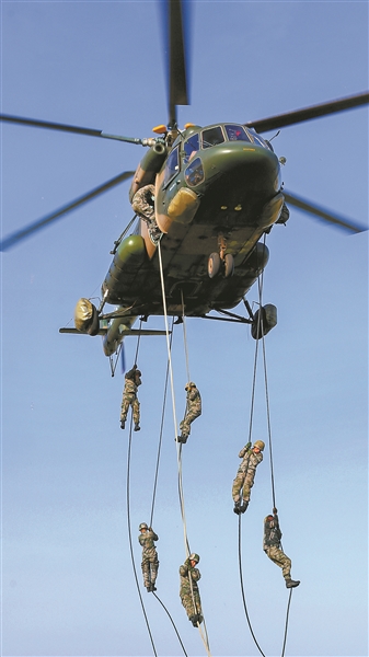 圖⑧:5月12日,第72集團(tuán)軍某陸航旅聯(lián)合某特戰(zhàn)旅進(jìn)行直升機(jī)索降訓(xùn)練。