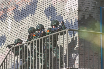 圖②:突擊小組搜索建筑物內(nèi)的“暴恐分子”。