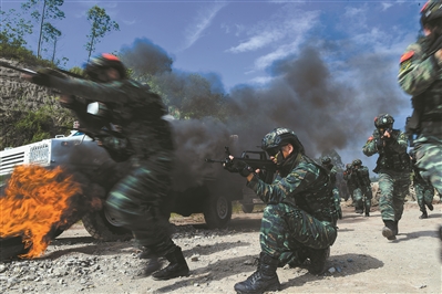 特戰(zhàn)隊員向“暴恐分子”發(fā)起突擊。