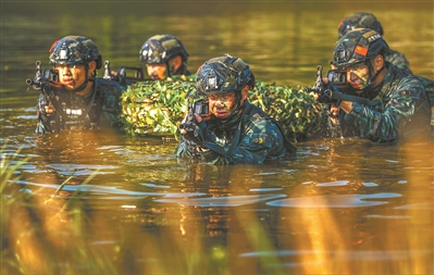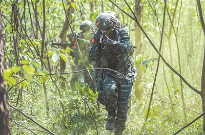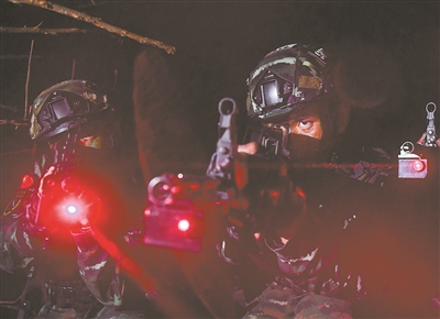特戰(zhàn)隊員參加夜間叢林追剿演練。