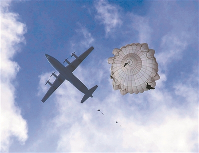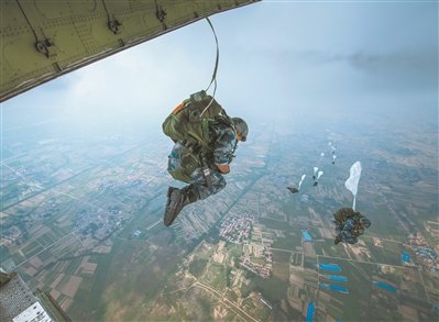 上午8時許,滿載傘兵的運輸機騰空而起。到達預(yù)定空域后,傘兵們聽從投放員口令,成雙路隊形依次躍出機艙。瞬時,朵朵傘花綻放于藍天。