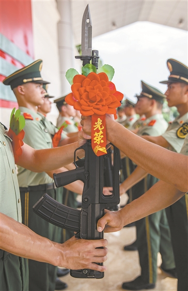 下圖:8月30日,武警廣西總隊機(jī)動支隊組織臨退役士兵與戰(zhàn)友交接執(zhí)勤槍支。