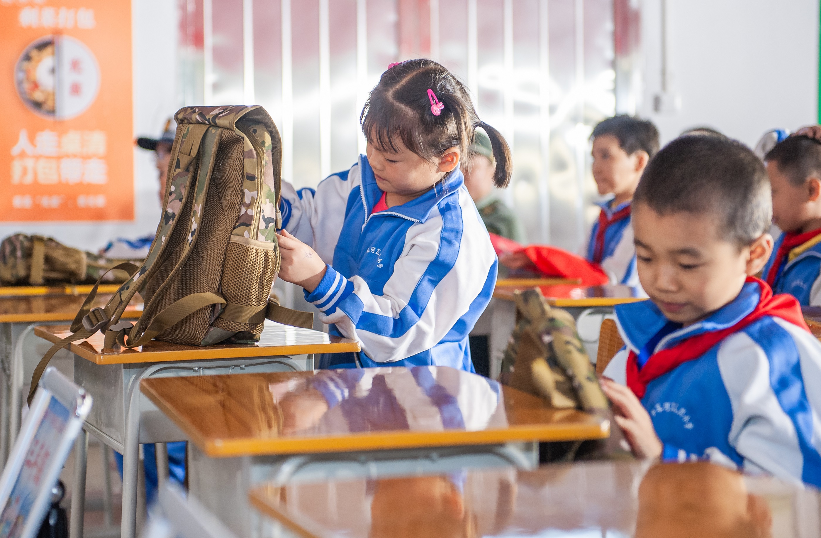 圖為瓦兒崗小學學生開心地打開迷彩小書包。彭三珊 攝