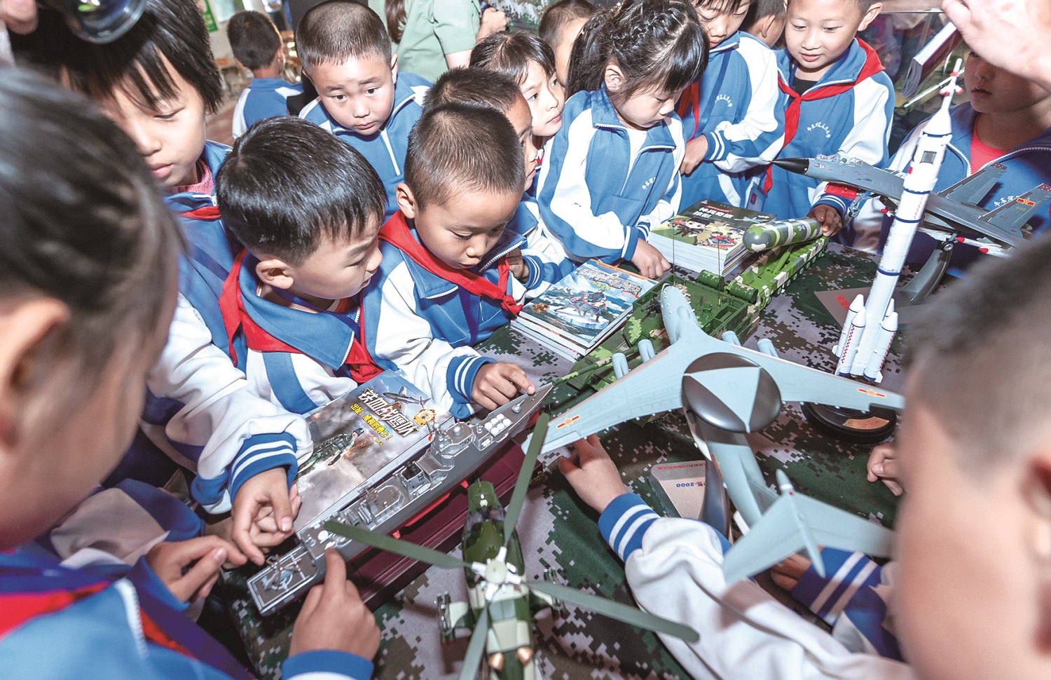 圖為瓦兒崗小學學生對贈送的武器裝備模型愛不釋手。彭三珊 攝