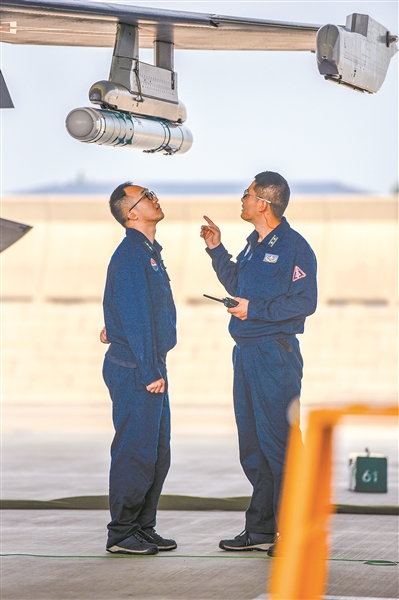 翻轉(zhuǎn)、規(guī)避、俯沖……殷凡明接連使出高難度動作,與“敵”機纏斗,為僚機實施進攻創(chuàng)造條件。張瑋則機動迂回,伺機從側(cè)翼發(fā)起攻擊。