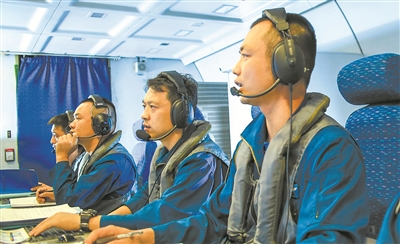任務(wù)艙內(nèi),雷達(dá)觀察員對(duì)“敵情”信息和水面目標(biāo)活動(dòng)情況仔細(xì)篩選研判,為偵別目標(biāo)提供支援。