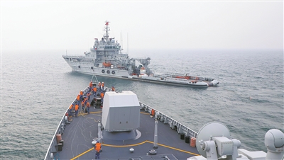 時(shí)值寒冬,海上風(fēng)力強(qiáng)勁。抵達(dá)某海域后,齊齊哈爾艦?zāi)M遭受“敵”襲擊失去動(dòng)力,編隊(duì)即刻展開拖帶訓(xùn)練。相關(guān)艦船部署人員迅速到達(dá)指定位置,各司其職,備便工具器材,聽令收放拖纜。聞令而動(dòng),官兵憑借過硬素質(zhì),通過密切協(xié)同,成功完成拖帶任務(wù)。