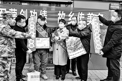 一人立功,全家光榮。1月29日,江蘇省徐州市豐縣人武部、退役軍人事務(wù)局和豐縣郵儲銀行負(fù)責(zé)人來到軍人張琦家中,為其家人送去立功喜報、獎金、春聯(lián)年畫和慰問品。