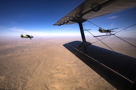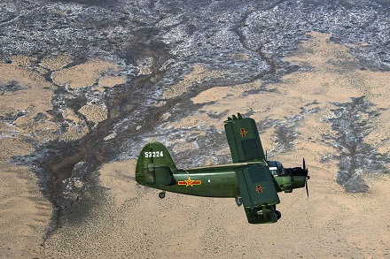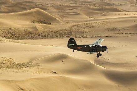 圖為官兵駕駛運(yùn)-5飛機(jī)飛越西北戈壁執(zhí)行飛播造林任務(wù)。劉暢 攝