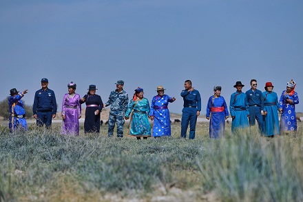 圖為官兵和牧民在草原感受飛播帶來(lái)的改變。