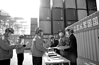 1月30日,山東省港口集團在某碼頭作業(yè)現(xiàn)場設(shè)立征兵咨詢站,為大學(xué)生員工解答征兵政策。黃向東 攝