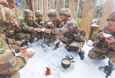 又走了4個(gè)小時(shí),夜色中到達(dá)宿營(yíng)地。大家撿來(lái)一些干枯的樹枝,生火做飯。晚來(lái)天寒,官兵們頭頂塑料布擋住雨雪,身下墊著樹葉展開睡袋和衣而臥。戰(zhàn)士們睡在靠近火堆的地方,侯云則把鋪蓋搬到了最邊上。