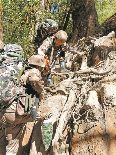 巡邏路上,會(huì)遇到很多大大小小的斷崖。每一次,侯云都先爬上去,再把戰(zhàn)士一個(gè)個(gè)拉上來(lái)。而到了危險(xiǎn)的濕滑陡坡,他會(huì)留在隊(duì)伍后面,把戰(zhàn)士一個(gè)個(gè)推上去。