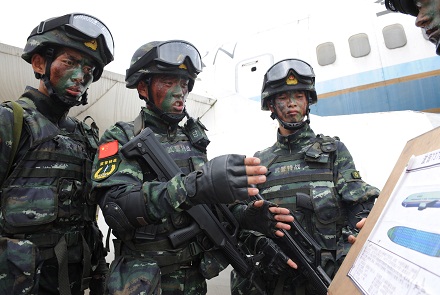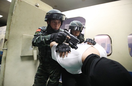 扮演歹徒的藍(lán)軍不按套路出牌,將飛機(jī)艙門用鐵絲鎖死,突擊隊(duì)員從艙外拉拽幾次無(wú)法突入。此時(shí),身為現(xiàn)場(chǎng)指揮員的彭星果斷下令,改用突擊車掛鎖拖拽、強(qiáng)行破門,兵分三路突入艙內(nèi)。當(dāng)槍聲突然從身后響起時(shí),藍(lán)軍被打了個(gè)措手不及,6名“歹徒”全部被“擊斃”。