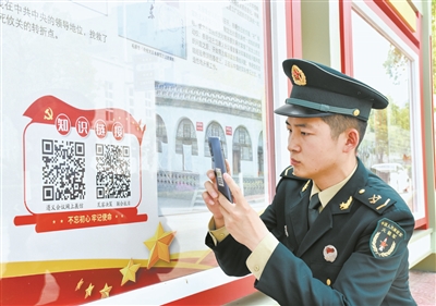 火箭軍某旅通過多種方式開展黨史學(xué)習(xí)教育。圖為3月24日,一名戰(zhàn)士在用手機掃描文化櫥窗里的黨史知識鏈接二維碼。范文佳 攝