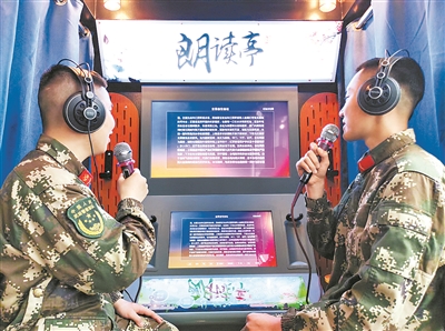 3月16日,武警重慶總隊執(zhí)勤三支隊城口中隊官兵在軍營朗讀亭朗讀紅色故事,學(xué)習(xí)黨史知識。李東 攝