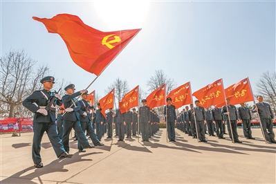 3月23日,北部戰(zhàn)區(qū)空軍舉行黨史學(xué)習(xí)教育啟動儀式,引導(dǎo)官兵用黨旗指引航向,培塑優(yōu)良作風(fēng)、錘煉勝戰(zhàn)本領(lǐng)。楊盼 攝
