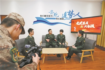 第80集團軍某旅在旅電視臺推出“黨史學(xué)習(xí)大家談”欄目,推動黨史學(xué)習(xí)教育走向深入。圖為官兵正在參與節(jié)目錄制。陳健 攝