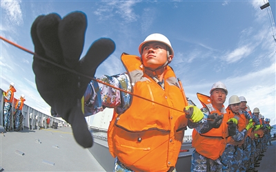 補(bǔ)給時(shí),官兵觀察艦船態(tài)勢(shì)。