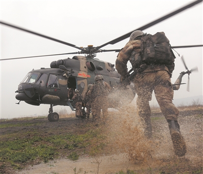 完成火力打擊后,數(shù)架運輸直升機(jī)從低空突入戰(zhàn)場,快速實施索降。著陸后,作戰(zhàn)隊員多路并進(jìn)、奪控要點,并對機(jī)降地域縱深之“敵”展開清掃。