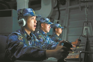 夜幕降臨,編隊轉(zhuǎn)入反潛訓(xùn)練。“方位××,距離××,發(fā)現(xiàn)金屬回音!”經(jīng)過仔細搜索,某艦發(fā)現(xiàn)“敵”潛艇,迅速通報編隊其他艦艇并對其實施打擊。