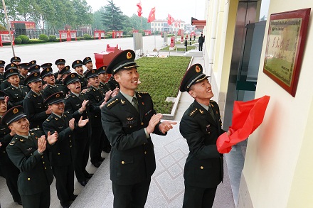 第83集團(tuán)軍某旅“紅一連”官兵在連隊門前懸掛“星火燎原”育人基地牌匾。張永進(jìn) 攝