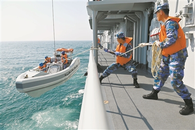 編隊抵達(dá)某海域后,又展開一場救生演練。“右舷有人落水,救生部署!”哈爾濱艦官兵迅速吊放右側(cè)小艇,4名救生員駕駛小艇抵達(dá)目標(biāo)位置,成功將落水人員救起。