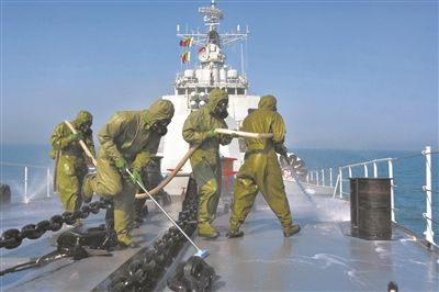 “發(fā)現(xiàn)有毒氣體,人員注意隱蔽!”青島艦拉響戰(zhàn)斗警報,各戰(zhàn)位人員迅速穿戴好防護(hù)裝具。防化分隊聞令而動,對艦艇重要部位進(jìn)行局部洗消。待艦艇高速駛離“染毒”區(qū)域后,立即打開水幕進(jìn)行全艦洗消。