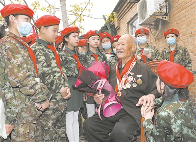 志愿軍老戰(zhàn)士康寶貞給前來看望自己的小學(xué)生講戰(zhàn)斗故事。李金良 攝