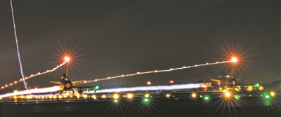 戰(zhàn)機在漆黑如墨的空中劃出一道道亮麗航線。