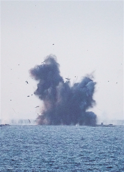 飛行員雷鳴和高科峰駕機(jī)升空后,立即與擔(dān)負(fù)支援掩護(hù)任務(wù)的另一架戰(zhàn)機(jī)組成3機(jī)突擊編隊,準(zhǔn)備突襲“敵”海上目標(biāo)。