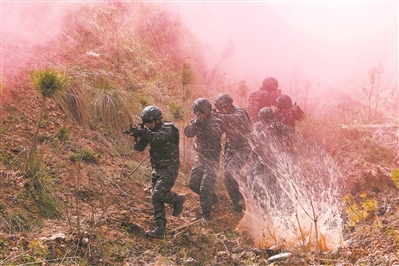 鐵拳出擊,攻勢凌厲。官兵爬陡坡、穿密林、涉水溝,將包圍圈不斷縮小?!氨┛址肿印北粐谝挥绾螅蝗粚?shí)施火力反抗,企圖乘亂逃竄。按照行動(dòng)預(yù)案,官兵迅速應(yīng)對,從不同方向展開圍堵,最終將“暴恐分子”悉數(shù)抓捕。