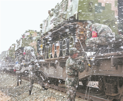 千里機(jī)動(dòng)至演練地域后,官兵頂風(fēng)冒雪卸載車輛裝備。