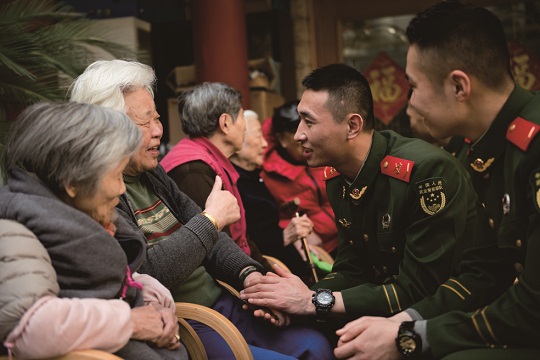 圖為武警上??傟?duì)執(zhí)勤第四支隊(duì)執(zhí)勤十中隊(duì)官兵到黃浦老年公寓開展服務(wù)。揭亦凡 攝