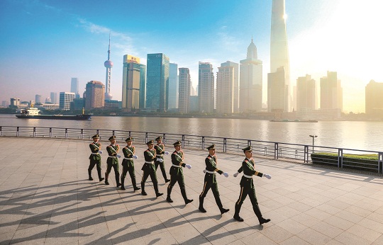 迎著晨光,武警上??傟?duì)執(zhí)勤第四支隊(duì)執(zhí)勤十中隊(duì)巡邏官兵走上戰(zhàn)位,一路經(jīng)過人民公園、人民廣場,來到南京路。