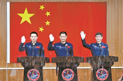 6月16日,神舟十二號載人飛行任務(wù)航天員聶海勝(中)、劉伯明(右)和湯洪波在酒泉衛(wèi)星發(fā)射中心與記者見面。本報記者 王衛(wèi)東攝