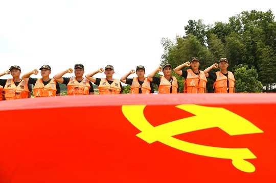 2020年7月18日,武警上饒支隊(duì)“00”后戰(zhàn)士王子浩在抗洪一線光榮入黨,面對(duì)黨旗,莊嚴(yán)宣誓。池小強(qiáng) 攝