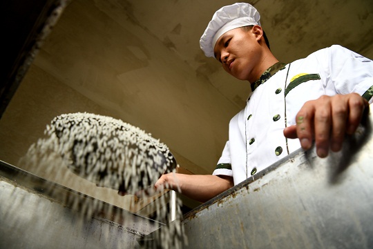 2021年5月26日,武警上饒支隊(duì)?wèi)?zhàn)士王子浩正在飯?zhí)貌僮鏖g煮飯炒菜。池小強(qiáng) 攝