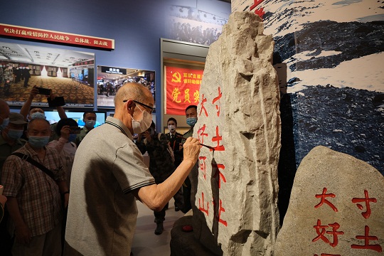 展柜里,有太多細(xì)節(jié)令人感動:王繼才去世當(dāng)日,在開山島升起的五星紅旗;新時代衛(wèi)國戍邊英雄群體的遺物,無聲地述說著“大好河山、寸土不讓”的鏗鏘誓言;2020年年初,軍隊(duì)支援湖北醫(yī)療隊(duì)省婦幼保健院光谷院區(qū)“黨員突擊隊(duì)”旗上密密麻麻的簽名;火箭軍援鄂醫(yī)療隊(duì)員集體簽名的防護(hù)服,在展柜燈光的映襯下閃閃發(fā)亮……
